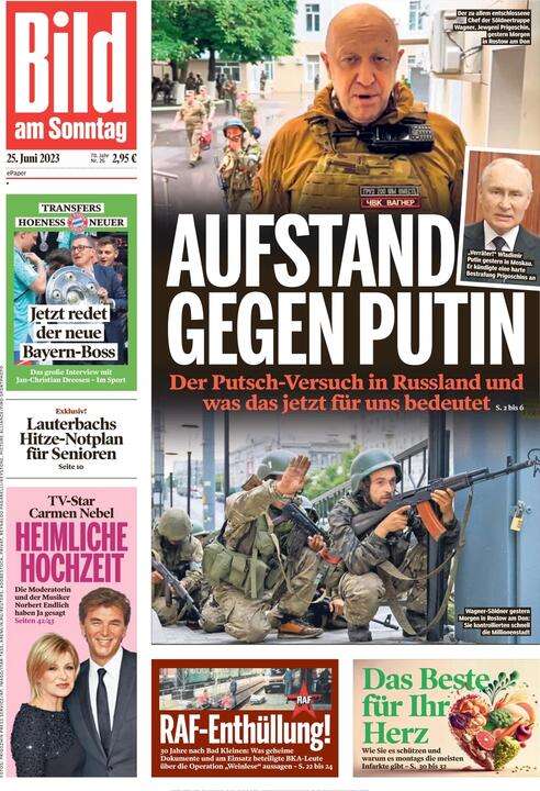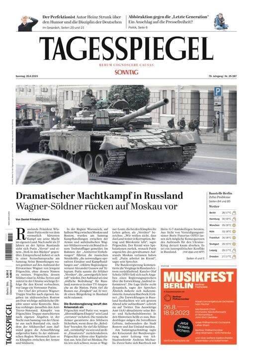 «Драматичная борьба за власть в России. Солдаты Вагнера движутся на Москву», — гласит заголовок немецкой Tagesspiel.