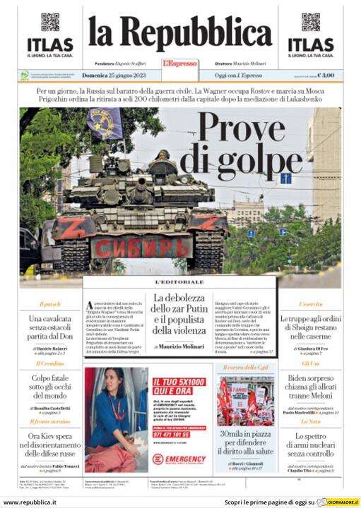 La Repubblica пишет о «слабости царя Путина» и о том, что Россия целые сутки балансировала на грани гражданской войны.