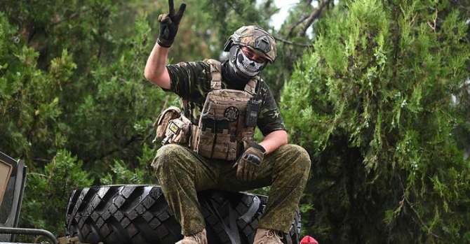 Боец частной военной компании «Вагнер» показывает победный знак на улице возле штаба Южного военного округа в городе Ростов-на-Дону, Россия, 24 июня 2023 года. Фото: Reuters