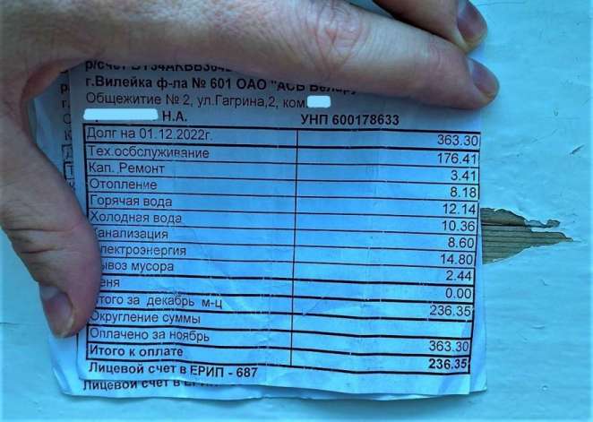 В девятиэтажном общежитии на улице Гагарина, 2 в Вилейке Наталья со своим сыном прожила восемь месяцев. Женщина рассказывает, что оплата постоянно поднималась, но, когда таракан залез в носик ее ребенка, она не выдержала и съехала. Общежитие принадлежит учреждению образования «Вилейский государственный колледж».