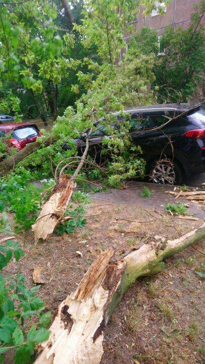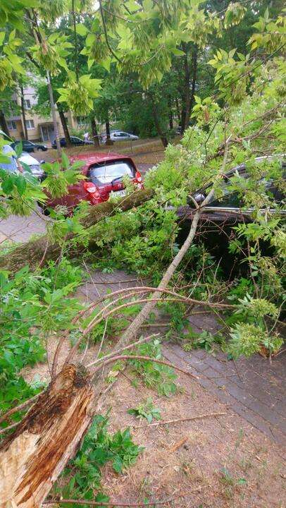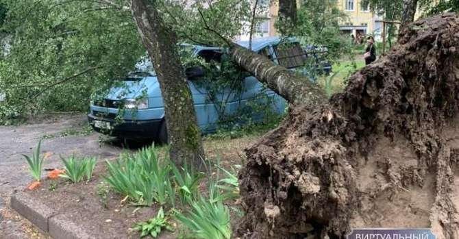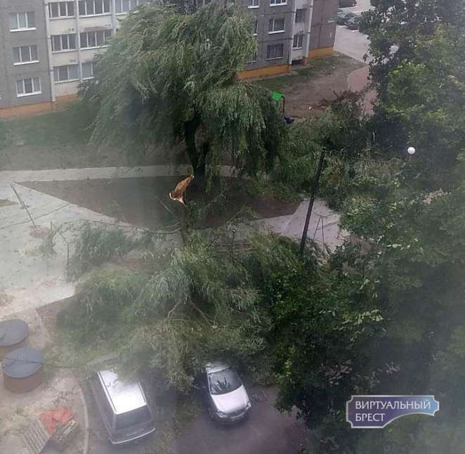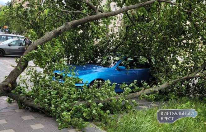 В Пинске деревья из-за сильного ветра падали во дворах, на улицах и пешеходных дорожках. Кое-где — прямо на автомобили, пишет «Виртуальный Брест».