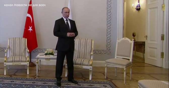 Но египетский руководитель, вероятно, опоздал, поэтому Путин был в комнате один. Необычно как-то такое видеть. Рассыпается образ. Нет на экране мощного отца нации, словно ледокол, рассекающего «вражеские» льдины.
