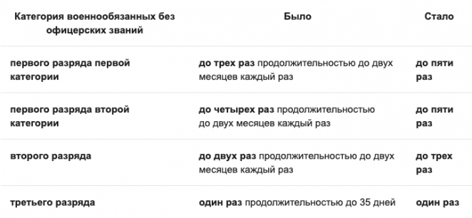 В старом документе четко прописывалось, сколько раз на сборы какой продолжительностью могут призываться военнообязанные. В новом постановлении продолжительность сборов убрали, оставив количество призывов.