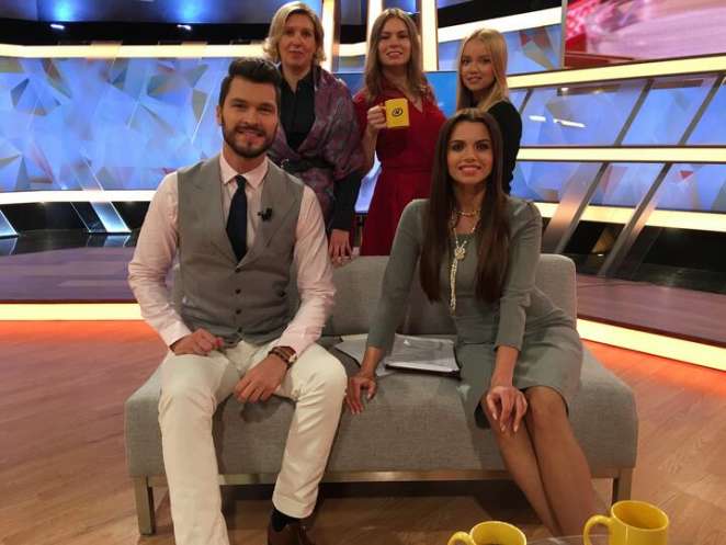 Ирина Сидорская (стоит первая слева) и Ксения Мартуль в студии телеканала ОНТ, 2016 год. Фото из личного архива героини материала