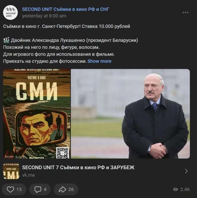 Кстати, двойнику Лукашенко обещают заплатить 10 тысяч российских рублей, а за роль Тихановской — всего 6 тысяч.