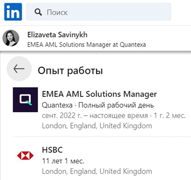 Судя по информации, которая размещена в профиле Елизаветы Савиных в социальной сети LinkedIn, с сентября 2022 года и по настоящее время девушка работает менеджером по разработке решений в области борьбы с отмыванием денег британской финансово-технической корпорации Quantexa.