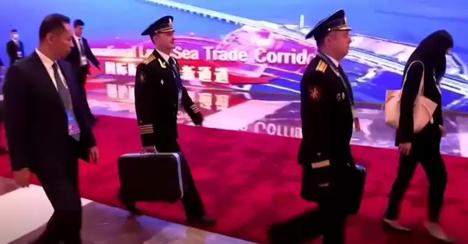 На обнародованных кадрах видно, как Владимир Путин после встречи с председателем КНР Си Цзиньпином в Пекине идет на другую встречу в окружении охраны, а за ним следуют два офицера ВМФ России в форме, каждый из которых несет портфель. Камера увеличивает масштаб одного из портфелей.