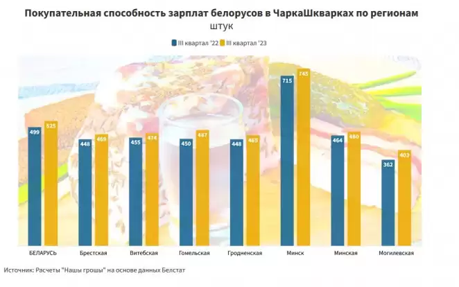 Из общей картины особенно выбивается Минск. С одной стороны, в столице за год зарплаты выросли за 30 чарок и шкварок (с 715 ЧШ до 745 ЧШ). С другой, нынешний показатель отличается от максимума, который был зафиксирован в I квартале 2022 года (тогда было 820 ЧШ) на целых 75 чарок и шкварок.