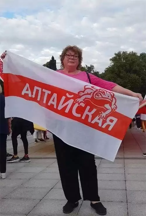 Елена Цимбалист на белорусском протесте с флагом своего района. 2020 год. Фото: личный альбом Елены Цимбалист