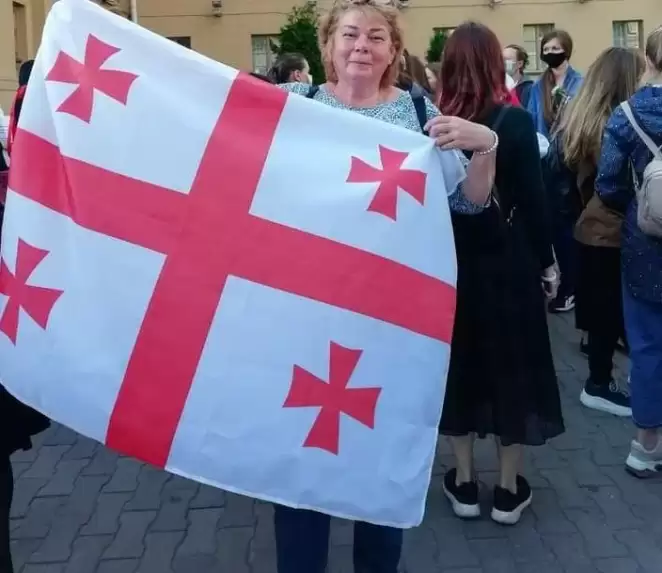 Елена Цимбалист на акции солидарности с Беларусью в годовщину выборов. С грузинским флагом, но белорусскими цветами. 9 сентября, 2023 год. Вильнюс. Фото: личный альбом Елены Цимбалист