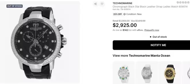 Черные часы похожи на хронограф от швейцарского бренда TechnoMarine. Стоимость таких, без учета скидки, составляет от 3300 до 3900 долларов.