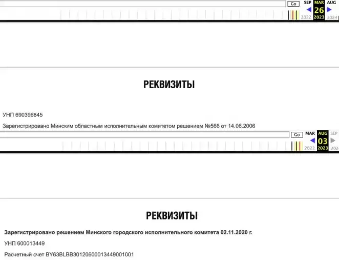 Реквизиты на сайте край.бай на март 2023-го и на 3-го августа 2023-го. Скриншот с сайта web.archive.org