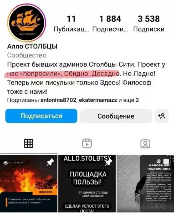 Подобное произошло и с инстаграм-страницей «Столбцы Сити», имеющей более 10 тысяч подписчиков. Об этом стало известно после того, как бывшие авторы страницы сделали свою — «Алло, Столбцы». В описании они указали, что их «попросили отдать страницу «Столбцы Сити» и теперь ее ведут сотрудники «Минской правды». Скриншот выложила у себя «киберказачка» Ольга Бондарева.