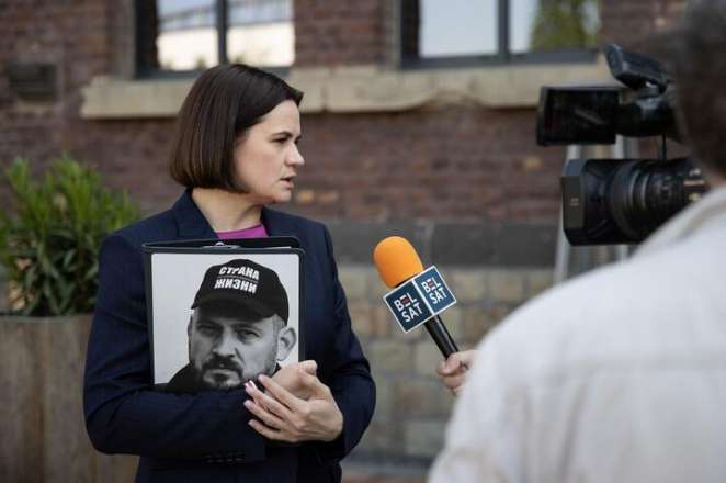 Светлана Тихановская с фотографией своего мужа, Сергея Тихановского. Фото: flickr.com