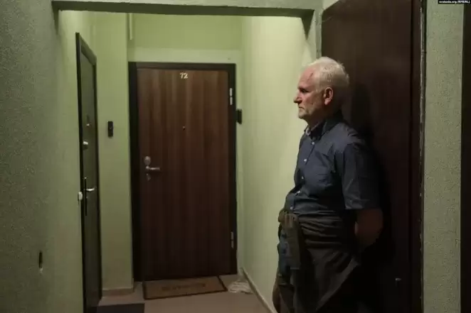 Алесь Беляцкий во время обыска у гендиректора БелаПАН Алеся Липая 13 июня 2018 года