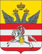 «Щит разделен надвое: в верхней части в золотом поле Российской империи половина государственного герба, а в нижней части, в красном с серебром полосатом поле на лошади воин, держащий в правой руке красный щит с двойным на нем крестом».