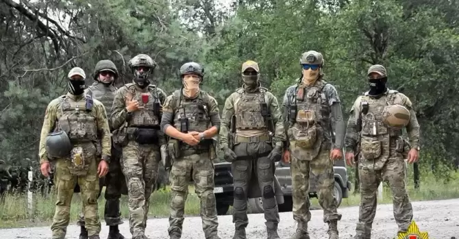 Белорусские военнослужащие сил специальных операций и боевики ЧВК «Вагнер» позируют во время маневров на полигоне недалеко от приграничного города Брест, Беларусь. 20 июля 2023 года. Фото: Министерство обороны Беларуси