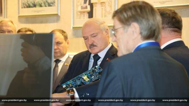 Александр Лукашенко рассматривает микросхему на совещании по Году качества 5 января. Фото: пресс-служба