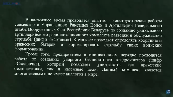 В распоряжении Белпола оказалось письмо, направленное 30 ноября 2021 года на имя Александра Лукашенко за подписью Александра Шакутина. Из него следует, что на заводе СВТ совместно с управлением ракетных войск и артиллерии Генштаба Вооруженных сил Беларуси проводятся опытно-конструкторские работы по созданию артиллерийского радиолокационного комплекса (АРК) разведки и обслуживания стрельбы (шифр «Вартавы»)». Этот комплекс позволяет определить координаты вражеских батарей и корректировать стрельбу своих военных формирований.