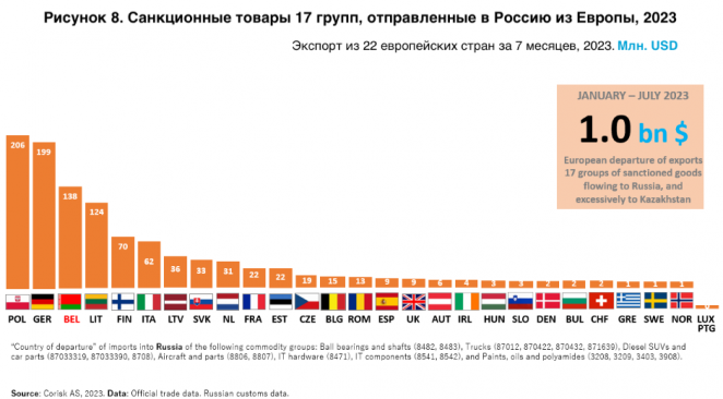 Авторы доклада обращают внимание на Беларусь: оценка чрезмерного экспорта и косвенных нарушений через нашу страну составляет 1,4 миллиарда евро. Однако эти данные, вероятно, существенно занижены.