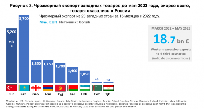 Всего за 15 месяцев с марта 2022 года по май 2023 года 21 западная страна превысила допустимый объем экспорта на сумму 18,7 млрд евро, что указывает на значительные объемы непрямого экспорта в Россию.