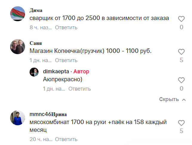 Кто-то заявил, что на стройке зарабатывает «3500 долларов», кто-то рассказал, что работает в Минске санитаркой за «630 рублей» в месяц, кто-то — в швейном ателье, «сама на себя» и получает «около 3000 бел.».