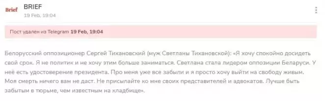 «Я хочу спокойно досидеть свой срок. Я не политик и не хочу этим больше заниматься. Светлана стала лидером оппозиции Беларуси. У нее есть удостоверение президента. Про меня уже все забыли, и я просто хочу выйти на свободу живым. Моя смерть ничего вам не даст. Не присылайте ко мне своих представителей и адвокатов. Лучше быть забытым в тюрьме, чем известным на кладбище».