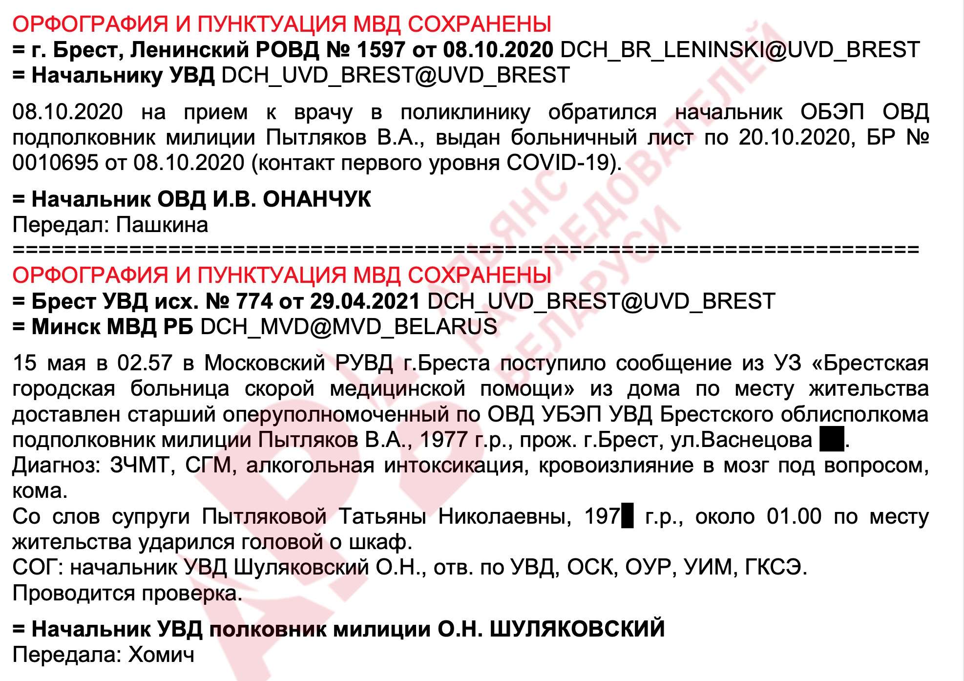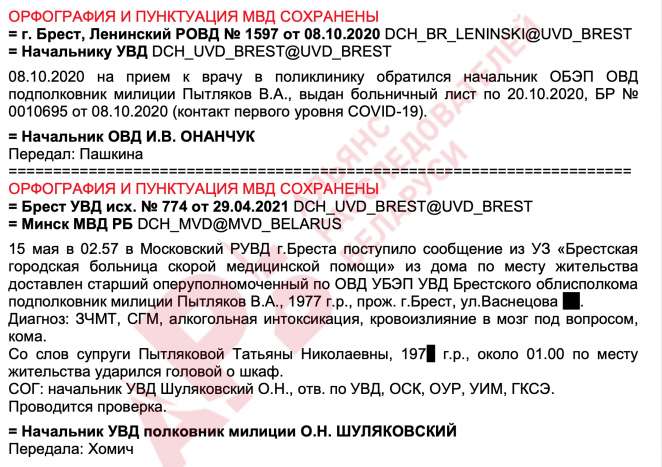 Ночью 15 мая 2021 года в Брестскую больницу скорой медицинской помощи в состоянии комы, вызванной алкогольной интоксикацией, черепно-мозговой травмой, сотрясением головного мозга доставлен бывший начальник ОБЭП, получивший повышение по службе на должность старшего оперуполномоченного по особо важным делам УБЭП УВД Брестского облисполкома подполковник милиции В.А. Пытляков. С помощью медицинской инициативы «Белые халаты» удалось узнать, что высокопоставленный убэповец умер.