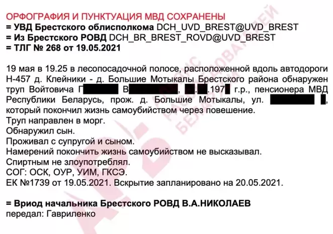 Первым ушел из жизни полковник в запасе Геннадий Войтович: 19 мая 2021 года в лесополосе у дороги в Брестском районе его нашли повешенным. Покойный вышел на пенсию в конце 2020 года с должности начальника управления охраны правопорядка УВД Брестского облисполкома. На пенсии жил в пригороде Бреста с женой и сыном-сотрудником МВД, спиртными напитками не злоупотреблял, намерений покончить жизнь самоубийством не высказывал.