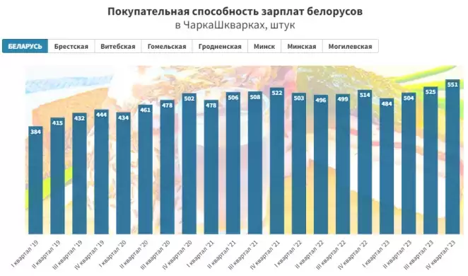 Итак, за четвертый квартал количество чарок и шкварок, которые может себе позволить беларус за среднюю заработную плату, составило 551, это исторический максимум, в третьем квартале 2023 года показатель был скромнее — 525 ЧШ.