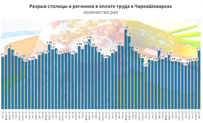 На следующем графике мы видим, что в первой половине 2023 года покупательная способность зарплат была примерно на уровне 2021–2022 года, но примерно с августа, когда инфляция замерла на минимальных уровнях, а зарплаты при этом продолжили наращивать, доходы в чарках и шкварках резко рванули вверх.
