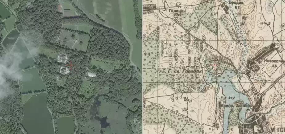 Территория резиденции «Озерный» на спутниковом снимке и «бывший господский двор» на межвоенной карте