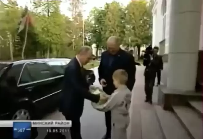 Лукашенко с сыном встречает кортеж премьер-министра Пакистана Наваза Шарифа. Скриншот из видео БелТА
