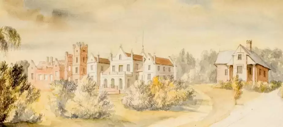 Центральное двухэтажное здание — это без сомнения дворец Тышкевичей, оно имеет ту же форму в плане, три оси окон на центральном ризалите и по одному на боковых. Исчезли готические щиты с пинаклями (декоративными мини-башнями), добавился этаж к когда-то одноэтажным вставкам между ризалитами. Второй этаж появился и над лоджией, которая вела к парку — мы не видим тот фасад, но центральная часть с той стороны выдвинута вперед ровно на столько, чтобы можно было об этом утверждать.