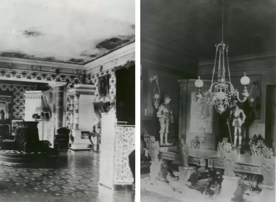 Интерьеры Острошицкого дворца в классическом и английском стилях. На втором фото видны те же доспехи и светильники, которые рисовал Альберт Жамет