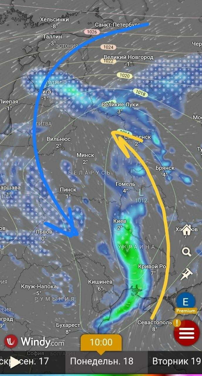«Завтра его центр окажется вблизи Витебска, а в понедельник он сместится на северо-восток Украины. И ему там понравится. Он станет малоподвижным и получит поддержку от влажных и теплых воздушных масс с Черного моря», — пояснили авторы канала.