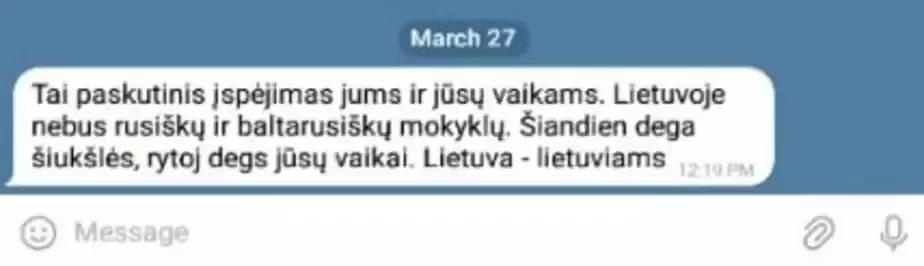 Тем временем утром 28 марта сообщение аналогичного содержания появилось в телеграм-чате «Беларусы ў школе. Вільня». Человек, подписанный как Artem, сбросил якобы полученную им «сегодня ночью» угрозу. Она особенно мерзкая: «Это последнее предупреждение вам и вашим детям. Сегодня горит мусор, завтра будут гореть ваши дети. Литва — литовцам».