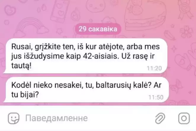 «Уже не первый раз я и мои знакомые в Вильнюсе получают сообщения с угрозами. Уже реально становится страшно за себя и за свою семью на самом деле. Что нам делать, куда идти в полицию или что?!»