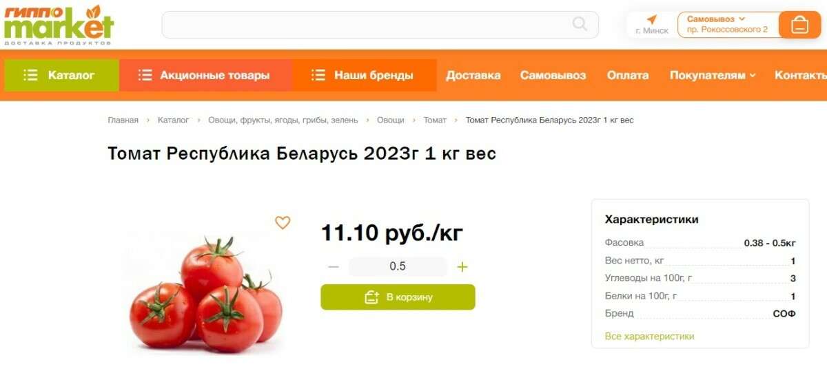 Мониторинг цен в службах доставки популярных белорусских торговых сетей показал, что найти помидоры дешевле сейчас достаточно сложно. Самую низкую цену удалось найти в магазине «ГИППО» — там за кило томатов белорусского производства просят всего 11,1 рубля, а вот за розовый сорт также белорусского производства придётся заплатить уже 14,3 рубля.
