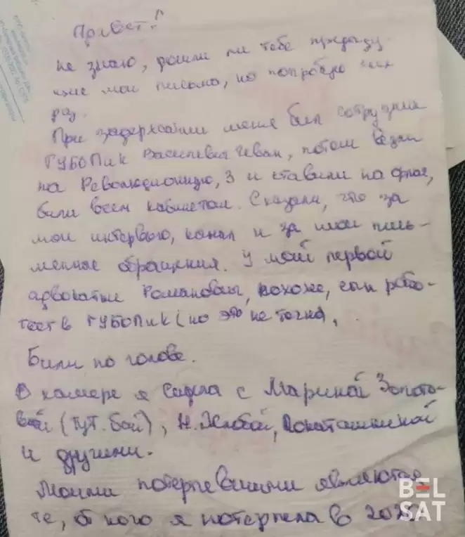 В письме на куске туалетной бумаги Екатерина пишет, что при задержании ее бил сотрудник ГУБОПиКа Иван Василевич, затем в штабе ГУБОПиКа на Революционной, 3 ее «ставили на флаг, били всем кабинетом». Сказали, что бьют за ее интервью, за телеграм-канал и за ее обращения.
