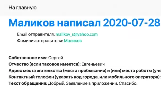 В базе КГБ действительно есть обращение от имени Сергея Маликова. 28 июля 2020 года он отправил сообщение «Добрый. Заявление в приложении. Спасибо». Что было в присоединенном файле, в базе не видно.