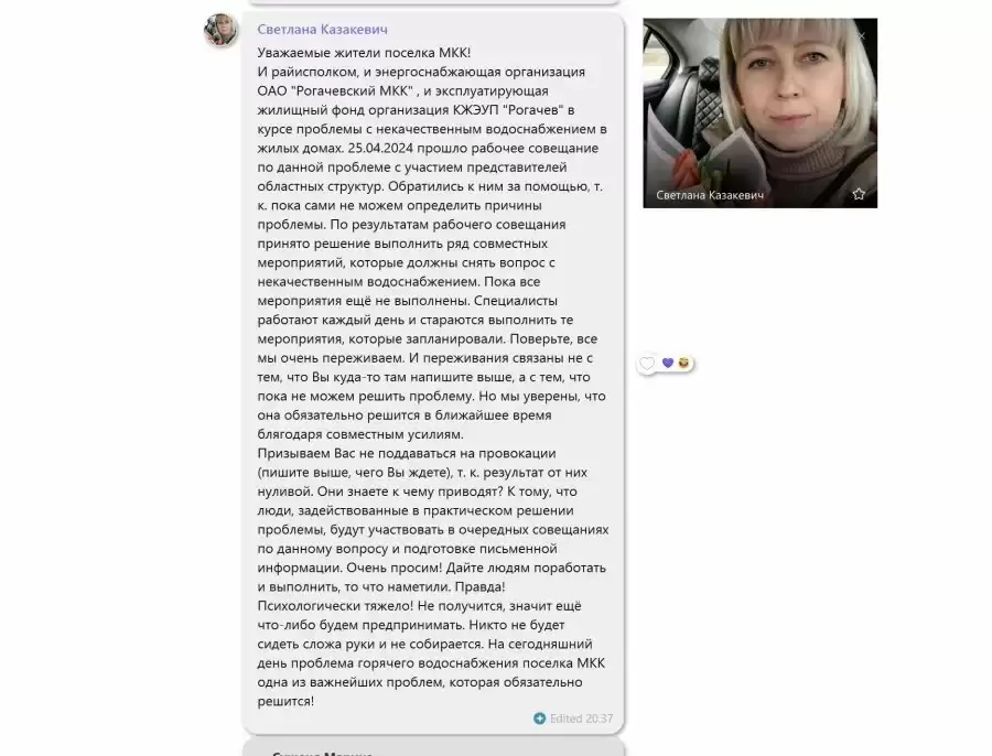 «Обратились к ним за помощью, так так пока сами не может определить причины проблемы. По результатам рабочего совещания принято решение выполнить ряд совместных мероприятий», — отметила Казакевич.