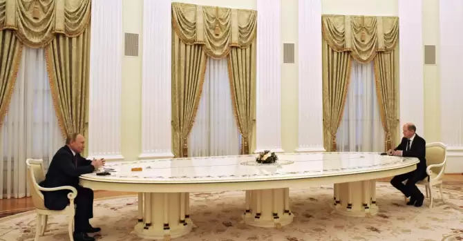 Встреча между Путиным и Шольцем проходила в стенах Кремля за тем длинным столом, который все помнят.
