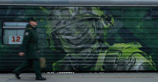 Российский военнослужащий проходит мимо вагона с рекламой службы в армии. Фото: Reuters