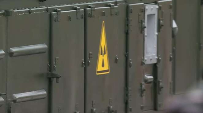 Знак радиационной опасности на борту пусковой установки ракетного комплекса «Искандер-М». Минск, 3 июля 2024 года. Скриншот видеорансляции