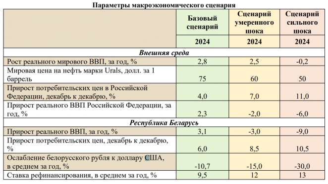 Эксперты Нацбанка обозначили три вероятных сценария. При базовом предполагалось сохранение макроэкономических тенденций в мире и в Беларуси. В этом случае ожидался рост экономики в этом году на 3,1%, инфляция на уровне 6% и ослабление рубля к доллару на 10,7%. Второй — сценарий умеренного шока — предусматривал падение экономики на 3%, снижение курса рубля к доллару на 15% и инфляцию в 8,5%. А третий — сценарий сильного шока — снижение ВВП на 9%, курса рубля к доллару на 30%, а инфляцию — 10,5%.