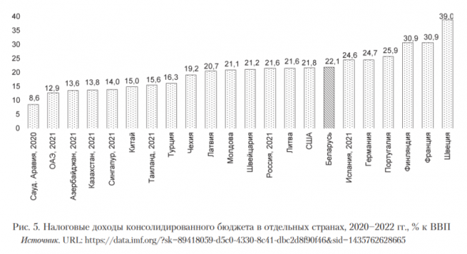 Налоговые доходы бюджета в 2022 году в Беларуси равнялись 22% ВВП, а с учетом средств ФСЗН – около 33% ВВП.