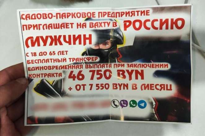 В листовке, фото которой прислал «Зеркалу» читатель, говорится, что на работу приглашают мужчин с 18 до 65 лет. Трудиться предлагают на вахте в России на некоем «садово-парковом предприятии», не уточняя, на каком именно. К высокой зарплате и единовременной выплате обещают бесплатный трансфер на место работы. На заднем фоне объявления — мужчина в камуфляже и с оружием в руках.
