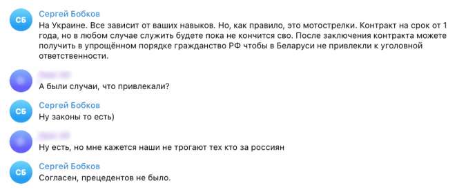 — Все зависит от ваших навыков, но, как правило, это мотострелки, — уточнил «кадровик» российской армии. — Контракт заключается на срок от одного года, но в любом случае служить будете, пока не закончится СВО. После заключения контракта можете получить в упрощенном порядке гражданство России, чтобы в Беларуси не привлекли к уголовной ответственности.