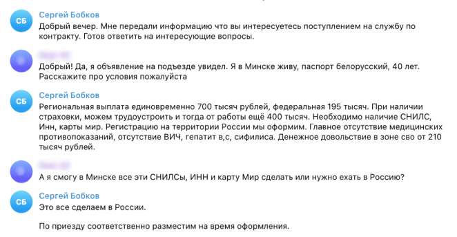 Переписка с вербовщиком российского Министерства обороны. Скриншот «Зеркала»